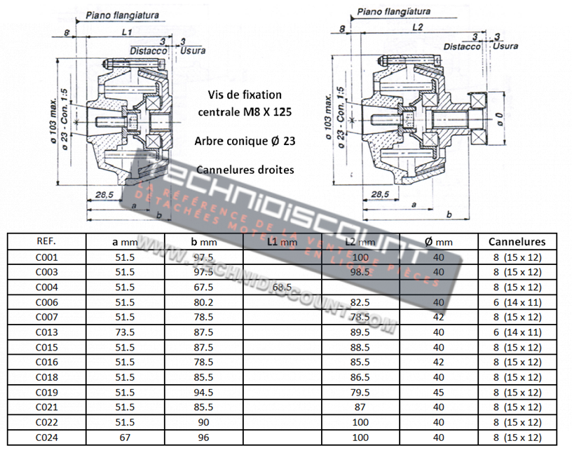 - Modèles avec vis de fixation centrale M8 x 125mm - Arbre conique Ø23mm - Cannelures droite :